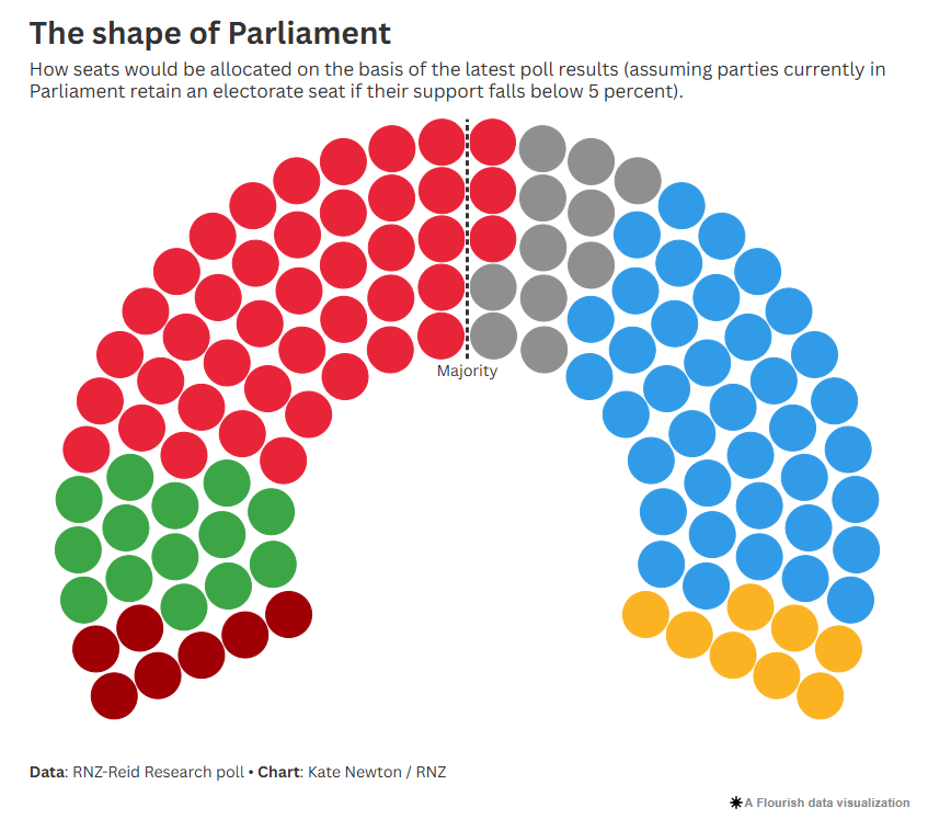 With Labour, the Greens and Te Pāti Māori all gaining compared to the previous poll taken in March, they would have a majority with 63 seats between them, compared to the coalition’s 57 – again, New Zealand First was the only coalition party to see a boost.