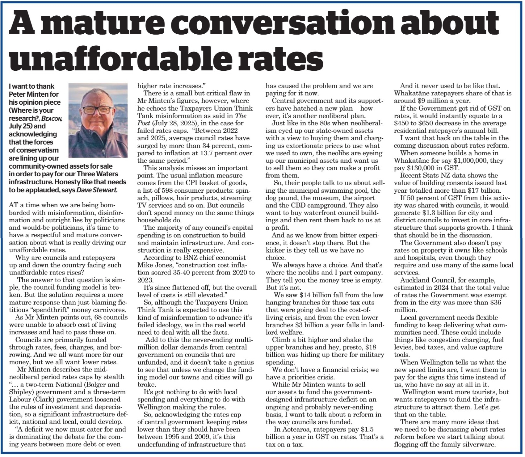 I want to thank Peter Minten for his opinion piece (Where is your research?, Beacon. July 25) and acknowledging that the forces of conservatism are lining up our community owned assets for sale in order to pay for our 3 Waters infrastructure. Honesty like that needs to be applauded.