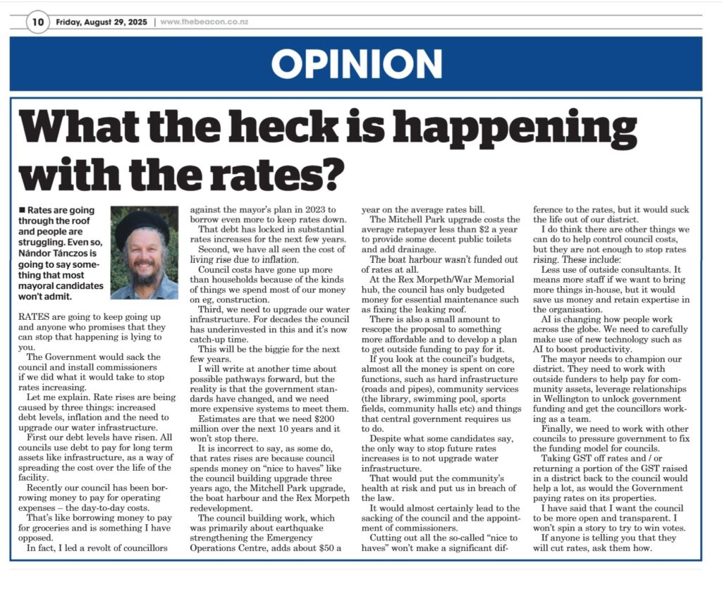 Rates are going through the roof and people are struggling. Even so, I’m going to say something that most mayoral candidates won’t admit. Rates are going to keep going up and anyone who promises that they can stop that happening is lying to you. The Government would sack the council and install commissioners if we did what it would take to stop rates increasing.